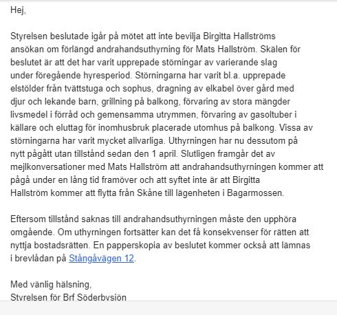 I slutet av Augusti kom ett brev som påtalade att vi inte hade sökt om förlängt tillstånd för andrahandsuthyring. Det kom typiskt nog inte till mig, utan till min syster….. Ja, ännu en miss men varför vänta så länge med påminnelsen? Styrelsen är ju väldigt medvetna om att jag bor kvar i lägenheten…… Hursomhelst, vi ordnade ansökan, den skulle behandlas på styrelsemöte den 12 :e september. Den 13:e fick jag följande mail.