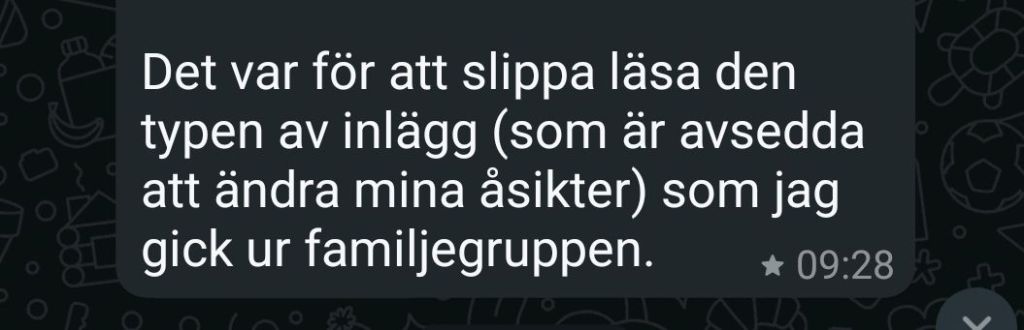 Det säkraste sättet för de som inte vill (vågar/förmår) uttsätta sin egen självbild, känsla av kontroll eller ”familjen godkända” bild av ”verkligheten” för densamma…. är därför att göra som Felicia och Manfred gjorde i så många år, så mycket som möjligt skydda den (av mamma….) godkända bilden av mig och verkligheten genom att låtsas som om jag inte existerade. Det är ett effektivt om än föga konstruktivt sätt att hantera kognitiv dissonsns. Tyvärr också en strategi som vissa andra (förutom mina syskon) redan verkar ha börjat tillämpa.