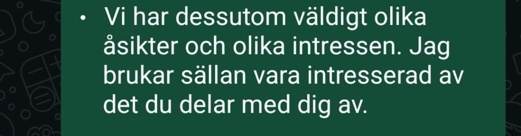 Eftersom ingen av mina barn någonsin har pratat med mig om detta så har jag varit tvungen att skapa min egen bild, en kvalificerad gissning som bygger på många års egen erfarenhet ihop med en stor mängd insikter efter skilsmässan då jag succesivt började förstå vad jag varit inblandad i och vad som skett efter att jag drog mig ur. Ni som var med ”på andra sidan” får mer än gärna ge er beskrivning.🤗
