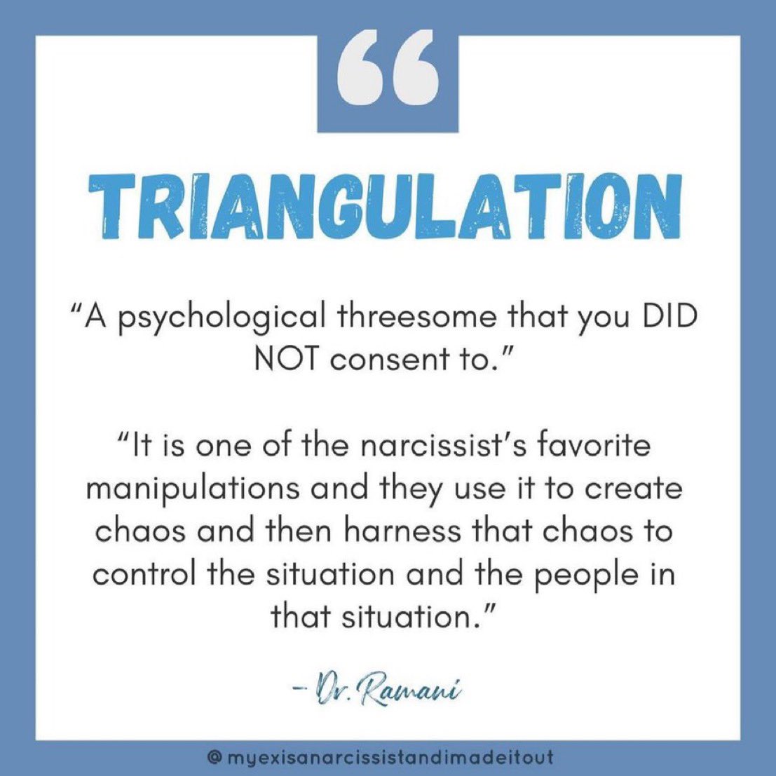 För en Narcissist så handlar Triangulering, som allt en Narcissist företar sig….. inte ”bara” om kontrollera andra utan även om att skydda och förstärka den egna självbilden.