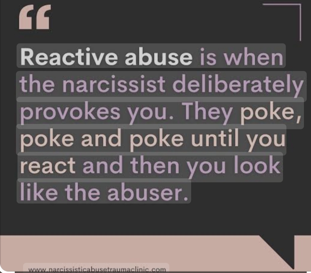 Reactive Abuse är en ett sätt för en Narcissist att provocera fram en känslomässig reaktion hos någon som ”bevisar” att det är denne som är abusive, galen, instabil. Eftersom Narcissism handlar mycket om att behålla den egna upplevelsen av att ha kontroll över sin omgivning så är en känslomässig reaktion ett utmärkt bevis på att Narcissisten ”vunnit”