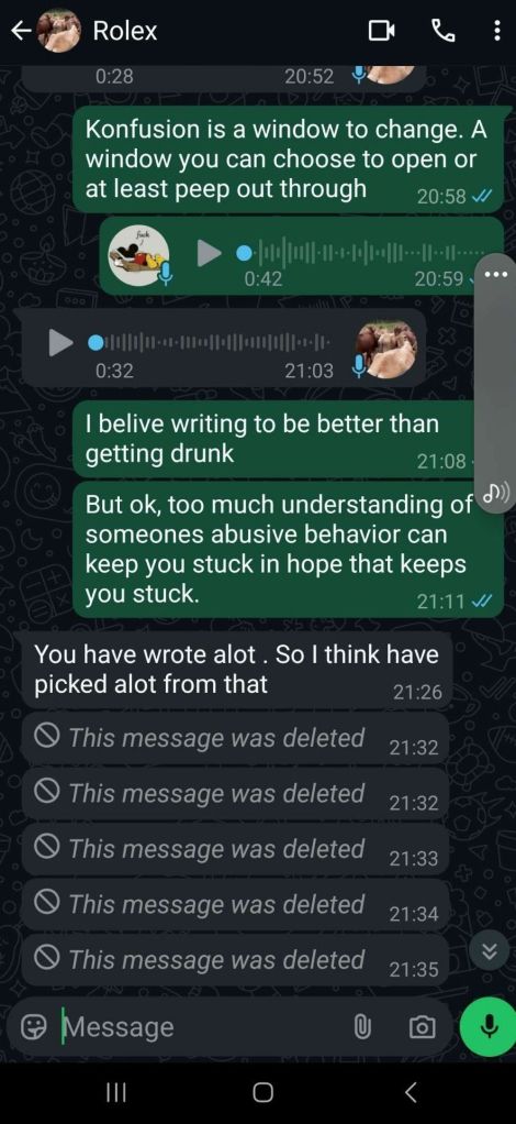 Skall Rolex och min relation kunna hålla och utvecklas tror jag att jag, under lugna omständigheter…. bör konfrontera henne med hur hennes ”galenskap” ser ut, något som inte varit möjligt om hon inte själv skriftligt dokumenterat den……. Ett av skälen till att jag inser att jag nog bör konfrontera henne är att vår relation har blivit bra igen lite oroande snabbt. Jag är orolig för att Rolex känner att hon återfått kontrollen och snart återgår till åtgärder för att behålla den. Jag är ju både hårt påläst och vis av många års egen erfarenhet av The Cycle of Abuse