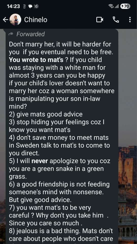 Min vän Chinelo från Nigeria som jag kände redan då Jag mötte Rolex men ännu idag aldrig träffat, utgjorde ett hot från första början och i februari, då jag ”kastade ut” Rolex (fast hon påstår att det var hon som föreslog en paus….) Blev Chinelo en måltavla för galenskap via såväl text som 14 röstmeddelanden.