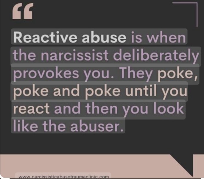 Reactive Abuse är en ett sätt för en Narcissist att provocera fram en känslomässig reaktion hos någon som "bevisar" att det är denne som är abusive, galen, instabil. Eftersom Narcissism handlar mycket om att .........